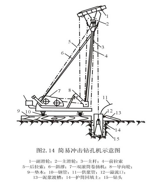 ①冲击钻机通过机架、卷扬机把带刃的重钻头(冲击锤)提高到一定高度,靠自由下落的冲击力切削破碎岩层或冲击土层成孔