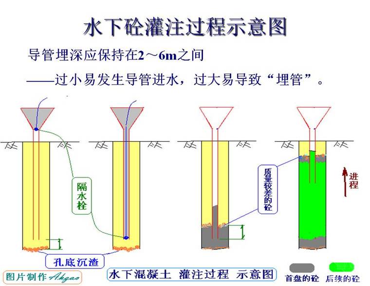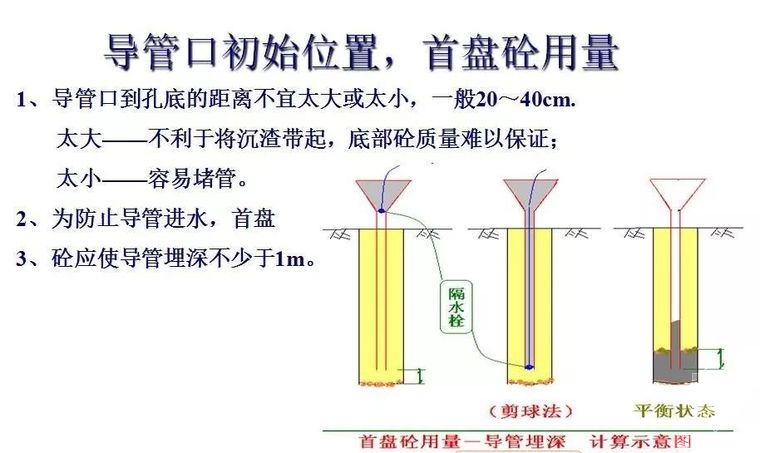 4.浇筑时,先将导管内及漏斗灌满混凝土,其量保证导管下端一次埋入混凝土面以下1.0m以上,然后剪断(或迅速拔出)悬吊隔水栓的钢丝,混凝土拌和物在自重作用下迅速排出球塞进入水中。