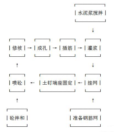 (1)开挖工作面,修整边坡安设土钉(包括成孔、插钢筋、注浆)绑扎钢筋网,加强筋、土钉同加强筋焊接、加垫块喷射第一层砼,厚度为50mm喷射第二层砼至设计厚度设置坡顶,坡面和坡脚排水措施。
