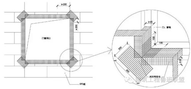 两布三涂玻纤网搭接至少100mm,且在外墙转角处、窗口四边翻包及窗口四角均应做加强处理,以免开裂,雨水渗漏。