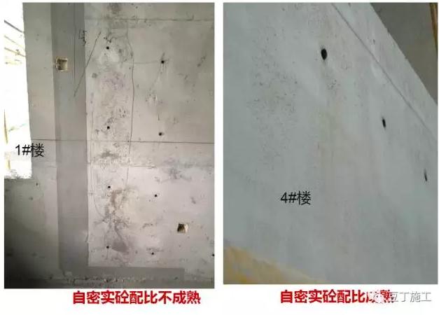 注: 尤其是自密实混凝土的配比和工作性能对后期浇筑之后的观感相当重要,下面就是四季阳光项目的1#楼和4#楼配比调整前后的观感对比。