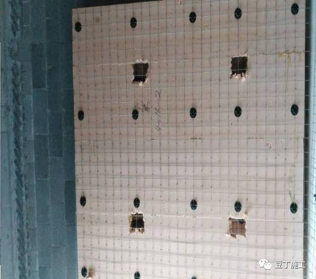 针对这个问题,项目部经过反复研究,最终想出了如下的解决方案,在保温板两端凿出直径约8公分的洞口,间距1米左右,这样既不会对屋内保温性能有很大的影响,也可以使内外混凝土达到互通的效果,最终解决了混凝土浇筑不到位的问题。保温开洞的图如下所示: