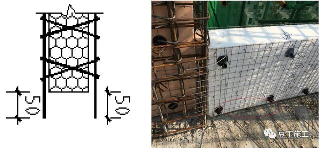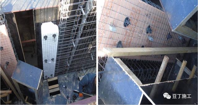 该位置应在模板支设前敷设孔径为2mm的钢丝网,多层缠绕。安装CL复合保温板时,为了满足保温板密实度更好,下部应留导流槽离地50mm。
