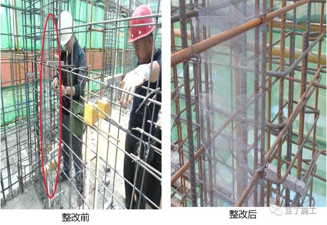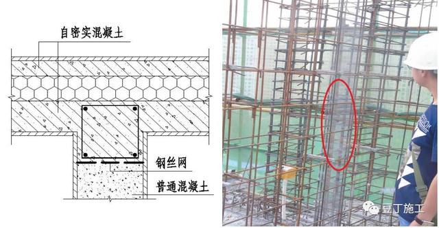 注:刚开始,项目按此施工,在暗柱边缘绑扎钢丝网,以暗柱钢筋为固定点绑扎,结果导致先浇筑普通混凝土的时候,普通混凝土通过钢丝网边缘流入外墙,毕竟柱钢筋保护层是2.5公分,钢丝网两边还有2.5公分的间隙,普通混凝土是可以通过其间隙流入外墙的,因为外墙无法振捣,导致外墙成型效果较差;后来我们为了让普通混凝土与自密实混凝土的分割效果更好,我们在绑扎钢丝网的部位的外侧增加两个直径8的钢筋,然后将钢丝网绑扎在外侧新增加的钢筋上,增加了钢丝网的拦截面积,使分割效果更好。其前后对比效果图如下: