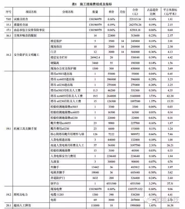③ 其他措施费用安全文明措施费:考虑到超高层施工要增加全封闭隔离措施防止坠落,费用约400万元,占分部分项工程费用的比例约为3.3%。施工及照明用电:约1300KW,费用约200万元。其他试验、检查、保险等费用,约100万元。