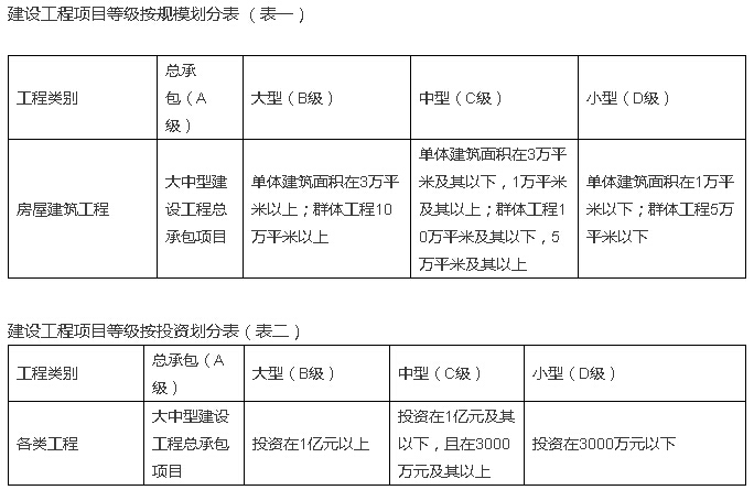 (表一)和(表二)对各级项目经理所能承担的工程项目规模限制做了基本规定,有关各类建设工程(包括公路、水利、电力、矿山、冶炼、石化、市政、机电等)规模的具体标准可参照《建造师执业资格考核认定实施细则》中《各专业大型和中型工程标准》执行,中型工程以下规模的工程均为小型工程。