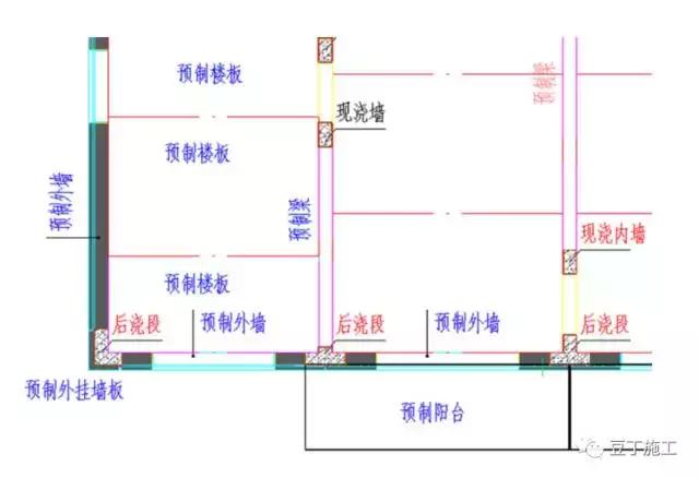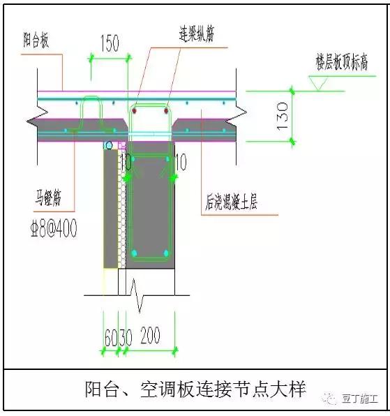 预制阳台及空调板为悬挑结构,与楼板连接采用甩筋方式连接。预制阳台上部钢筋伸入楼面现浇板,与面筋绑扎连接。预制阳台与预制外墙内叶板搭接10mm。