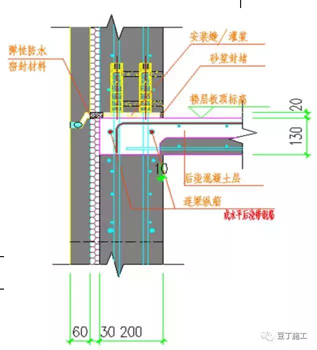 墙体外侧采用弹性防水密封胶条进行封堵,防止注浆料从外侧渗漏,同时可保证上下层墙体之间保温的连续性。