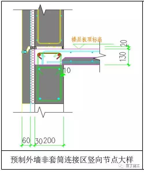 非套筒区域直接通过注入高强灌浆料连接,现浇板面筋伸入预制外墙进行弯折锚固。