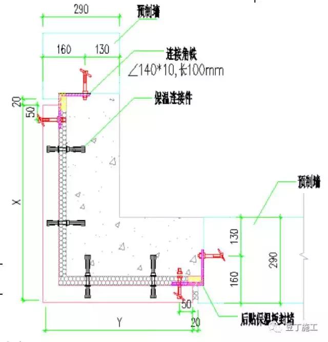 PCF板与混凝土后浇段通过保温拉结件粘接连接,PCF板与两侧预制外墙连接通过设置L型连接角铁,角铁型号为14010,长100mm。