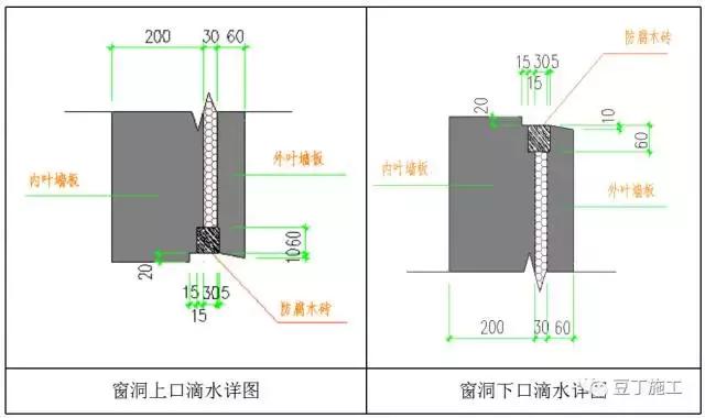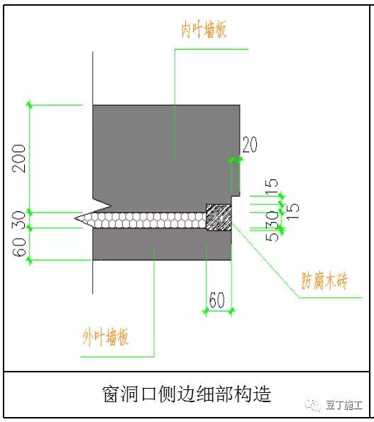 在窗洞上下口和侧部都设置企口、防腐木,防腐木尺寸为100X60X50mm,内穿锚筋一端锚固入内叶墙一端锚固入外叶墙,50mm厚的防腐木入外叶墙15mm,入内叶墙5mm。