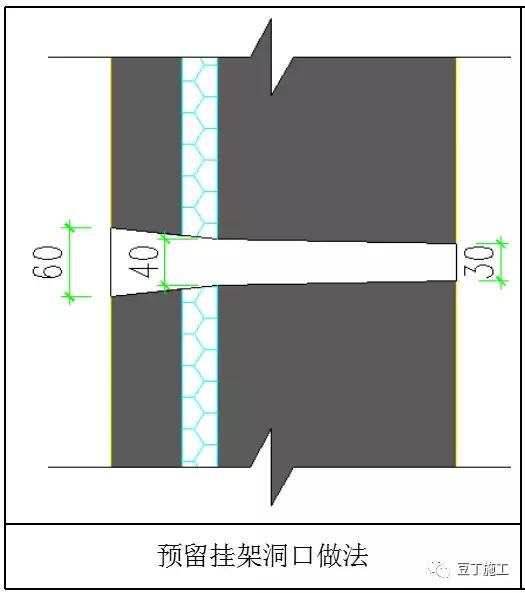 外挂架预留孔采用喇叭口形:其中内叶墙内侧面、内叶墙外侧面、外叶墙外侧面处孔径分别为30mm、40mm、60mm。