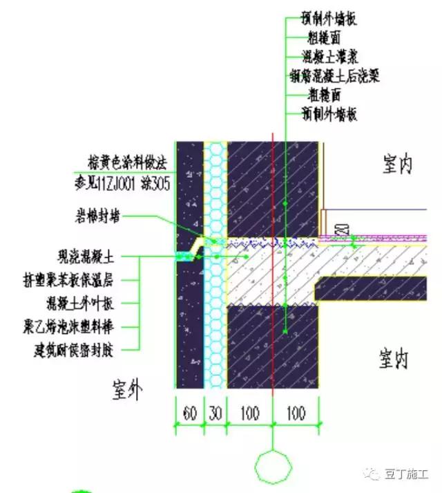 外墙从内至外依次为现浇混凝土、挤塑聚苯板保温层、混凝土外叶板、聚乙烯泡沫塑料棒、建筑耐候密封胶,保温层之间选用弹性防水密封材料封堵。