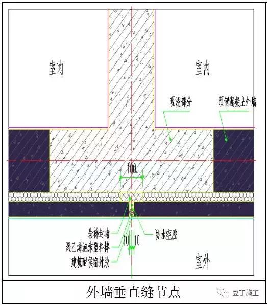 外墙由内至外依次为现浇混凝土、岩棉封堵、防水空腔、聚乙烯泡沫塑料棒、建筑耐候密封胶。