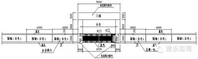 1、工地大门:采用砖砌体做门柱,截面尺寸为1.01.0m,大门净宽6.0m,高6.5m,门楣高1.5m,净高5.0m,门柱从地面起2.0m为蓝色,门楣为蓝色,其余部位为白色。门楣从左至右标上标上企业标志,用宋体字标上企业名称。字体高度1.1m,上下左右居中。在右大门上开一个900mm(宽)1800mm(高)的小门,以方便施工人员进出。大门中部布置1.0m高铁,刷涂成蓝色。大门右侧围墙均匀布置五牌一图,左侧围墙布置企业简介,大小为900mm(宽)1400mm(高),牌间间距200mm。