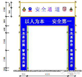 6、安全通道防护棚进口两侧应搭设钢管立柱(900900),在通道防护棚进口处张挂安全警示标志牌和安全宣传标语。