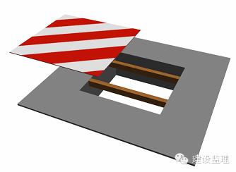 洞口楔紧两根木方,洞口上盖18mm厚木胶合板,并用铁钉定牢,面刷红白相间的警示油漆,间距20cm,角度45。