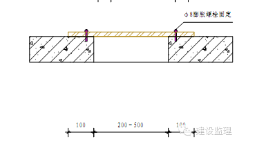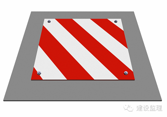 采用洞口上部盖18mm厚木胶合板,并用Ф8膨胀螺栓固定,面刷红白相间的警示油漆,间距20cm,角度45。