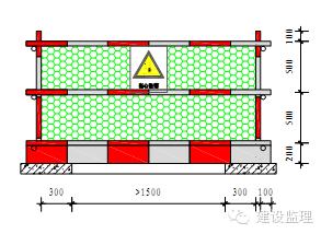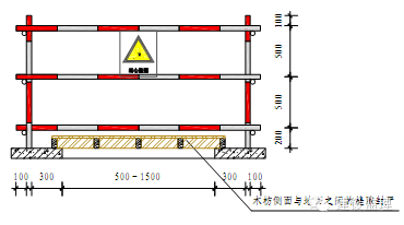 ②防护栏杆的水平杆、立杆必须刷400mm相间的红白警示油漆,所有水平杆控制伸出立杆外侧100mm。