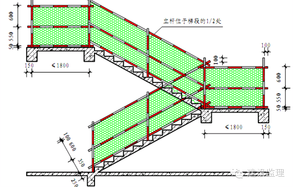 ①楼梯及休息平台临边采用Ф48钢管搭设防护栏杆,设置水平杆三道。