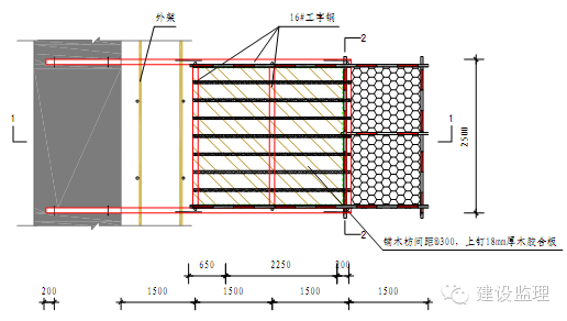 (2)卸料平台采用16#工字钢焊接主框架,纵向工字钢长6.0m,横向长2.5m,上铺501002000mm@300木方,面层铺18mm厚木胶合板。
