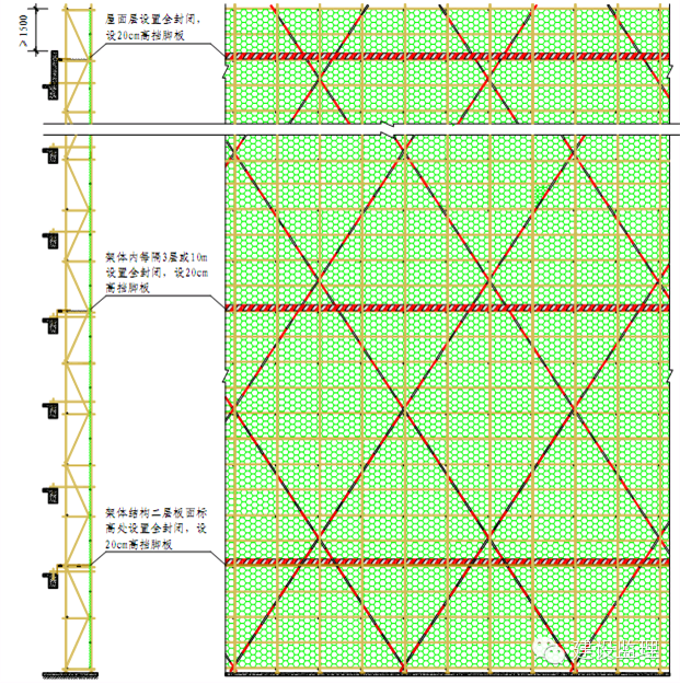 (2)施工电梯应单独搭设,与外架完全分开,施工电梯平台脚手架应设置之字斜撑,每层平台两侧设两道防护栏杆,高1.2m,底部设置18mm厚200mm高木胶合板作为挡脚板。挡脚板和防护栏杆均涂刷相间400mm红白警示油漆。立杆内侧满挂密目网。所有水平杆控制伸出立杆外侧100mm。