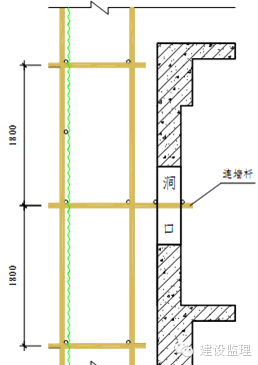 (5)下边沿至楼板或底面低于800mm的窗台等竖向洞口,如侧边高差大于2.0m时,需架设1200mm高防护栏杆,洞口宽度1.8m的采用单立杆,打入1Ф18钢筋,深度200mm,外露150mm,与立杆焊接。洞口宽度>1.8m时,按照楼层临边防护要求进行防护栏杆设置。