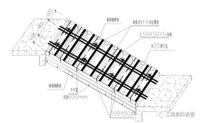 3.5 梯段模板加固采用14对拉螺杆及钢管进行加固。沿梯段长度方向,最下及最上一个踏步设置一道对拉螺杆,中间每隔3个踏步设置一道对拉螺杆。沿梯段宽度方向,对拉螺杆离模板外侧不大于300mm,中间对拉螺杆间距不大于800mm。梯段底模背楞采用双钢管加固。梯段侧面模板采用方木及步步紧进行加固,步步紧沿梯段长度方向间距为600mm。