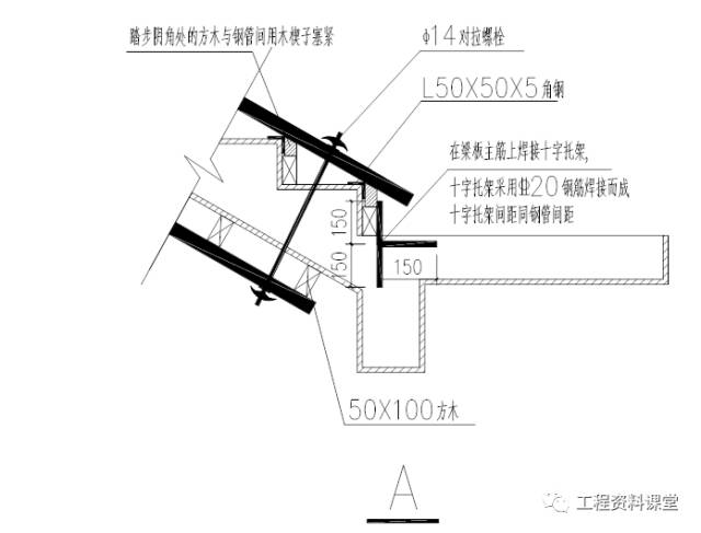 3.7 在楼梯平台设置十字托架,用以固定楼梯踏步模板。十字托架采用直径20mm的HRB400级钢筋焊接而成,焊接在梁板主筋上,十字托架间距同钢管间距。