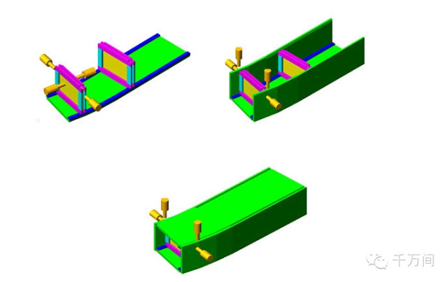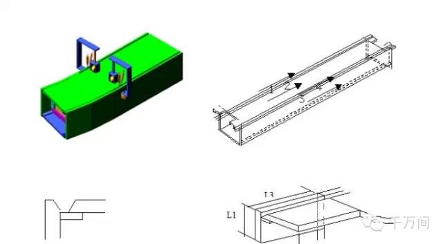 2.4然后将箱型柱的两块翼板置于滚道上,使三块箱型柱面板的一端头平齐再次用油缸进行夹紧,最后将隔板、腹板、翼板进行定位焊,保证定位焊的可靠性