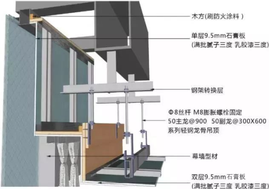 3.9mm厚多层板刷防火涂料三度,用自攻螺丝与龙骨固定;