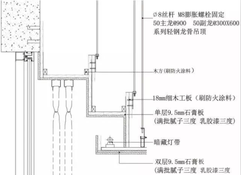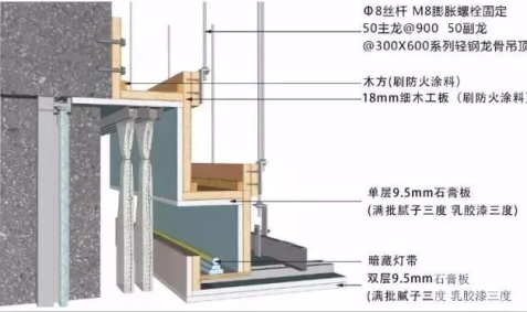 3、18mm细木工板刷防火涂料三度,与吸顶吊件采用35mm自攻螺丝固定