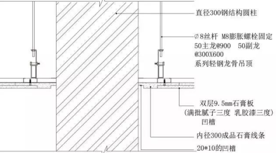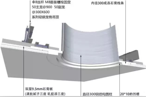 3.加工定制成品石膏线条,内经300mm,外径450mm,预留20*10的凹槽;