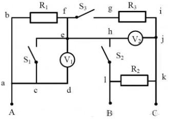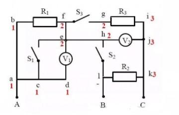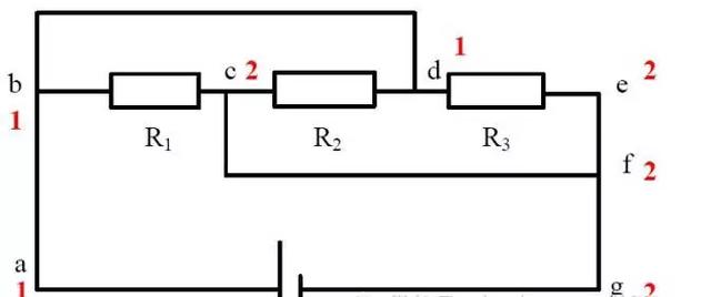 a.标号,A点正极,S1,S3闭合,所以a,b,c,d,e,f,g,h都标记1,过R3标记i,j,k标记2;过R2,l标记3,B点是负极,停止标号