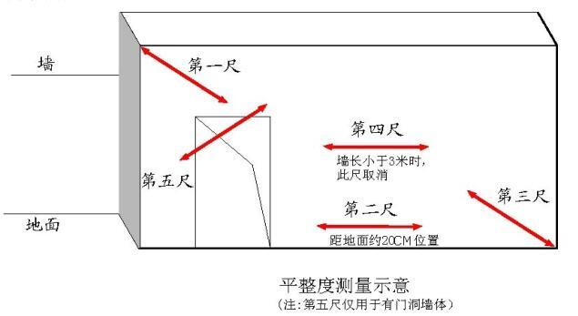 1.2.1 利用 2 米靠尺及塞尺,测量墙面平整度,每次测量时靠尺一端应伸至墙顶部或者墙根部,主要检查墙面四个角;墙面有门窗洞口的,靠尺应跨门窗洞口检测两次墙面平整度。