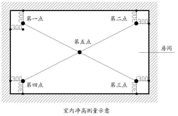 7.2.4 各房间地面的 4 个角部区域,距地脚边线 30cm 附近各选取 1 点,在地面几何中心位选取 1 点,测量出找平层地面与天花顶板间的 5 个垂直距离,即为 5 个室内净高实测值。