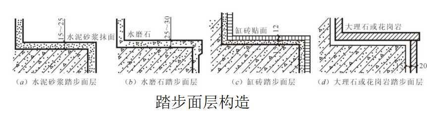 楼梯踏步要求面层耐磨、防滑、易于清洁,构造做法一般与地面相同,如水泥砂浆面层、水磨石面层、缸砖贴面、大理石和花岗岩等石材贴面、塑料铺贴或地毯铺贴等。