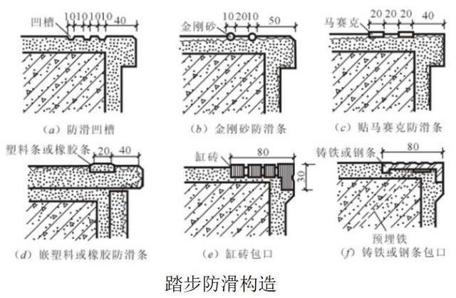 在人流集中且拥挤的建筑中,为防止行走时滑跌,踏步表面应采取相应的防滑措施。通常是在踏步口留2~3道凹槽或设防滑条,防滑条长度一般按踏步长度每边减去150mm。