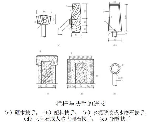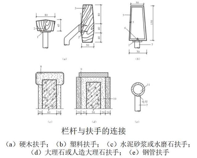 一般按两者的材料种类采用相应的连接方法,如木扶手与钢栏杆顶部的通长扁铁用螺钉连接,金属扶手与钢栏杆焊接,石材扶手与砌体或混凝土栏板用水泥砂浆粘结。