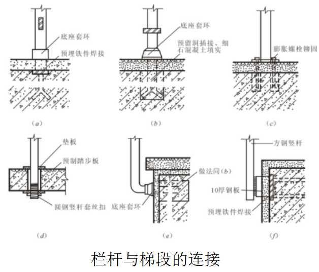 栏杆通常用以下三种方法安装在踏步侧面或踏步面上的边沿部分: