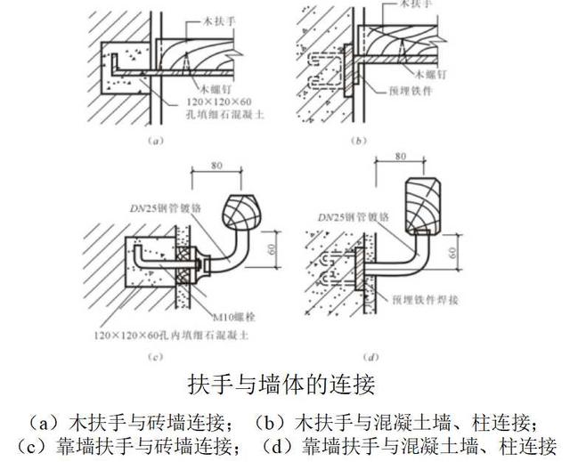 当扶手与混凝土墙、柱连接时,一般采用预埋钢板焊接,如图(b)、(d)所示。