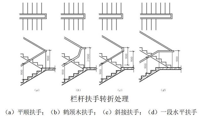 当平台宽度较窄时,扶手不宜伸进平台,应紧靠平台边缘设置,扶手为高低连接,在转折处形成向上弯曲的鹤颈扶手(图(b))。