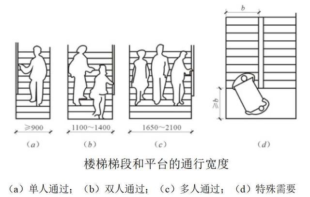 楼梯平台有中间平台和楼层平台之分。为保证正常情况下人流通行和非正常情况下安全疏散,以及搬运家具设备的方便,中间平台和楼层平台的宽度均应等于或大于楼梯段的宽度。