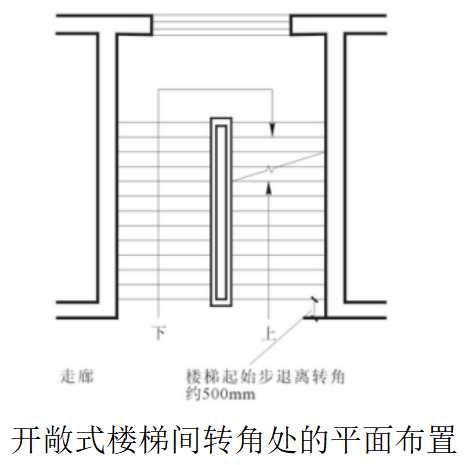 在开敞式楼梯中,楼层平台宽度可利用走廊或过厅的宽度,但为防止走廊上的人流与从楼梯上下的人流发生拥挤或干扰,楼层平台应有一个缓冲空间,其宽度不得小于500mm。
