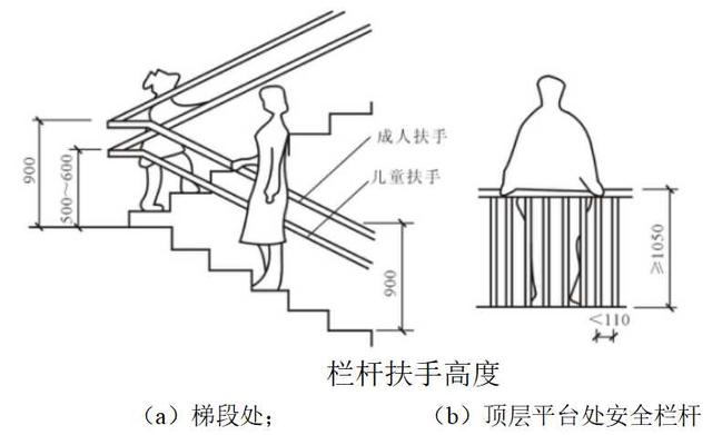 扶手高度应与人体重心高度协调,避免人们倚靠栏杆扶手时因重心外移发生意外,一般为900mm。供儿童使用的楼梯扶手高度多取500~600mm。