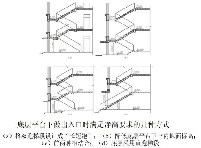 当在底层平台下做通道或设出入口,楼梯平台下净空高度不能满足2000mm的要求时,可采用以下办法解决: