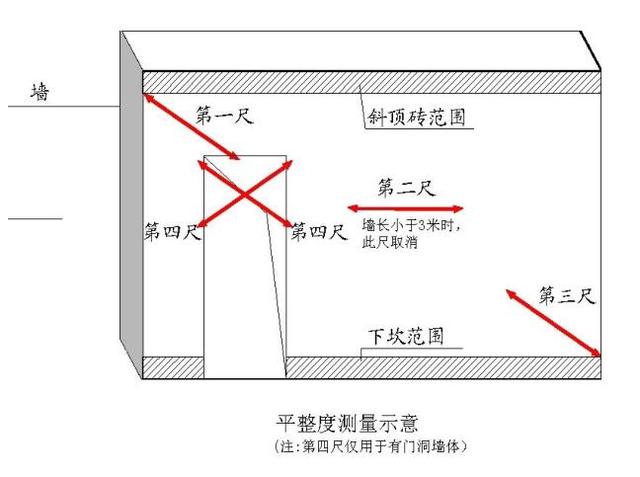 1.2.1 利用靠尺和塞尺,测量墙面平整度,每次测量时靠尺一端应伸至墙顶部或者墙根部,主要检查墙面四个角。