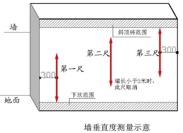 2.2.1 采用靠尺测量墙面垂直度,每次测量时靠尺一端应伸至砌体顶部(斜砖下部)或者反坎上部,与墙面平整度检测同步进行。