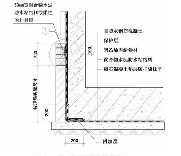 ⑥ 在垫层及永久性保护墙在铺贴卷材防水层,转角处加贴卷材附加层,铺贴时应先底面、后立面,四周接头甩槎部位应交叉搭接,并贴于保护墙上,从垫层折向立面的卷材永久性保护墙的接触部位,应用胶结材料紧密贴严,与临时性保护墙(或围护结构模板接触部位)应分层临时固定在该墙(或模板)上。