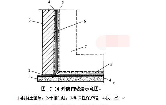 ⑦油毡铺贴完毕,在底板垫层和永久性保护墙卷材面上抹热沥青或玛碲脂,并趁热撒上干净的热砂,冷却后在垫层,永久性保护墙和临时性保护墙上抹1∶3水泥砂浆,作为卷材防水层的保护层。